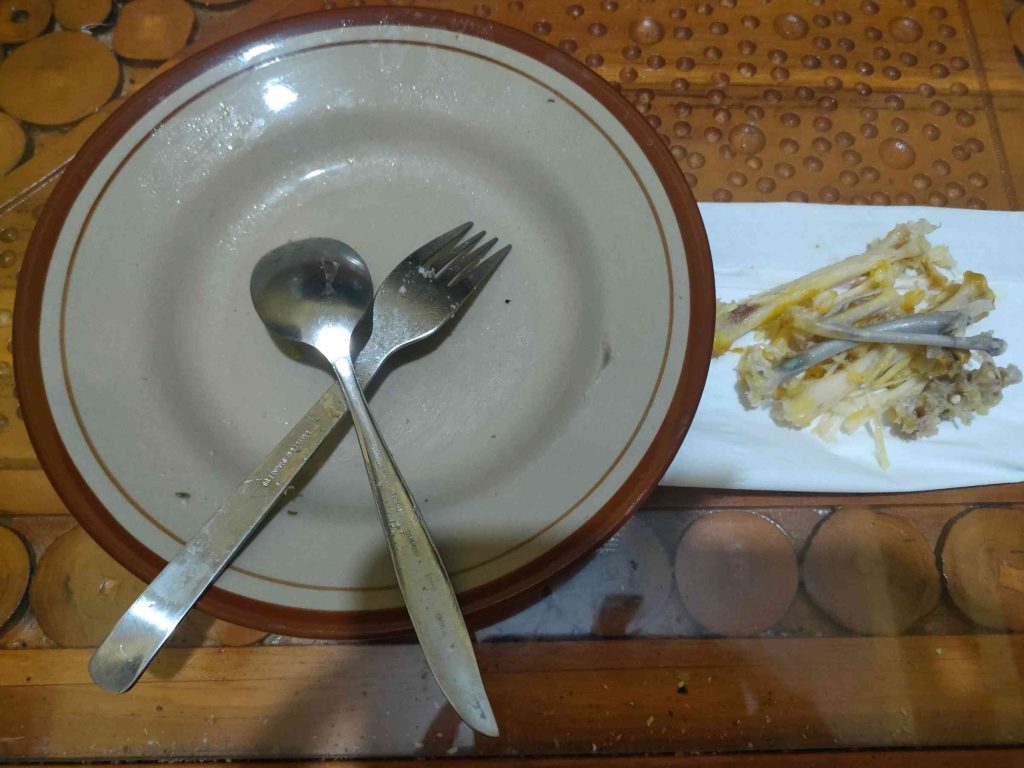 Setelah makan, istri melihat piring saya dan berkata bahwa piring tersebut bersih seperti milik Mbahe, yang merupakan panggilan untuk bapak saya. Bapak saya meninggal beberapa bulan yang lalu dalam usia 95 tahun. Ia selalu menjaga kebersihan piring saat makan, bahkan hanya tersisa satu butir nasi pun ia akan memakannya.