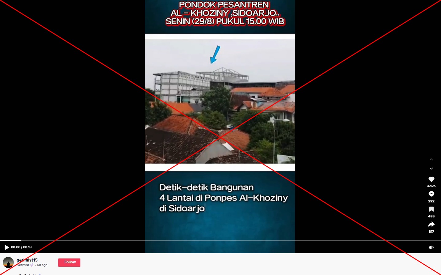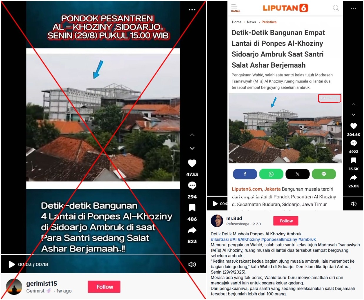 Setelah insiden ambruknya bangunan bertingkat di Pondok Pesantren Al-Khoziny di Sidoarjo yang menewaskan puluhan santri, beredar sebuah video kecerdasan buatan (AI) di media sosial dengan klaim bahwa klip tersebut menunjukkan detik-detik saat peristiwa terjadi. Faktanya, klip yang beredar berasal dari video asli yang awalnya menyertakan tanda air aplikasi pembuat video AI. Bangunan yang digambarkan dalam video itu juga berbeda dari bangunan asli yang runtuh.