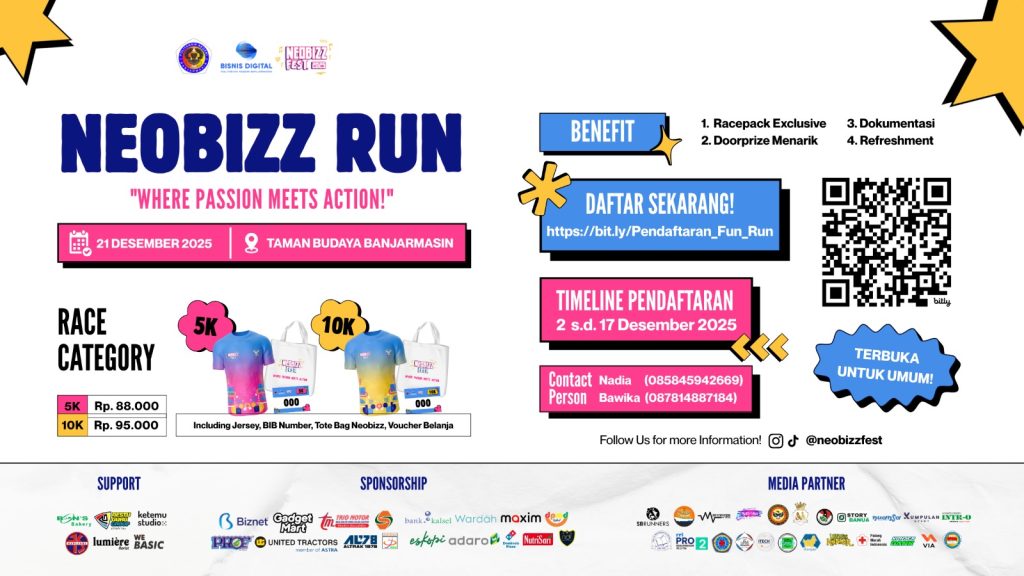BANJARMASIN, 12 Desember 2025 – Sebagai upaya mendorong gaya hidup sehat sekaligus mendukung kreativitas lokal, Program Studi Bisnis Digital Politeknik Negeri Banjarmasin (Poliban) melalui event Neobizz Fest akan menggelar ajang lari bertajuk Neobizz Run 2025. Acara ini dijadwalkan berlangsung pada Minggu, 21 Desember 2025, bertempat di Taman Budaya Banjarmasin.